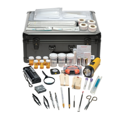Este é um excelente kit para agentes de busca em cenas de crime. O conteúdo permite uma busca preliminar com luz ultravioleta de ondas longas para localizar evidências como fibras e manchas. O kit inclui todo o equipamento necessário para coletar, marcar e preservar todos os tipos de evidências físicas. Instruções e livreto de procedimentos incluídos.