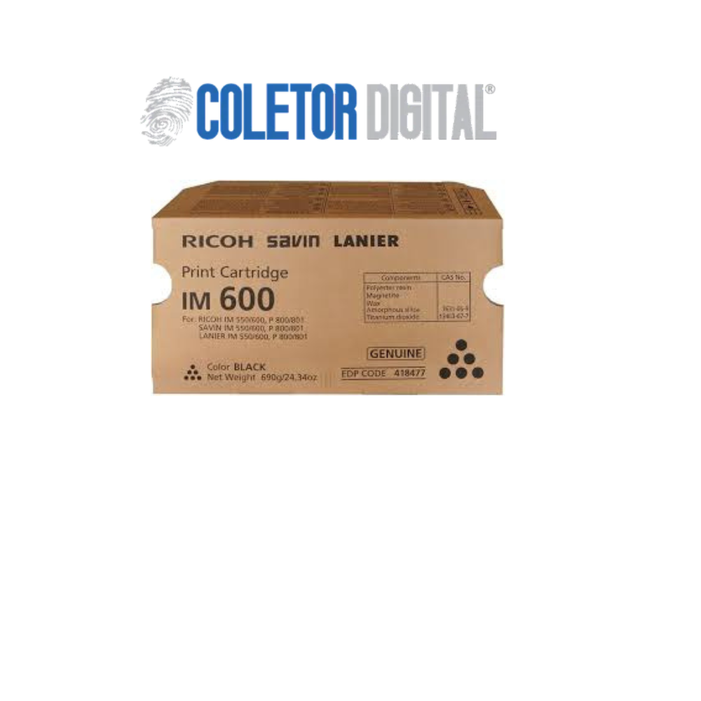 Cartucho de toner original Ricoh 418477 preto, utilizado nos equipamentos: IM550 IM 550, IM600 IM 600, P800 P 800, P801 P 801 . Toner original com rendimento de até 25.500 páginas, considerando 5% de cobertura no papel A4. Possui garantia de 03 meses para defeitos de fabricação. Marca: Ricoh.